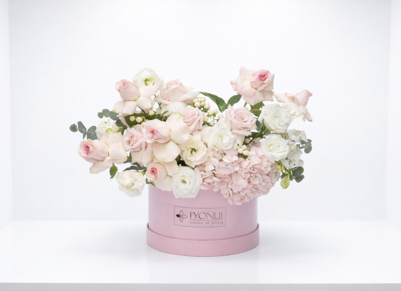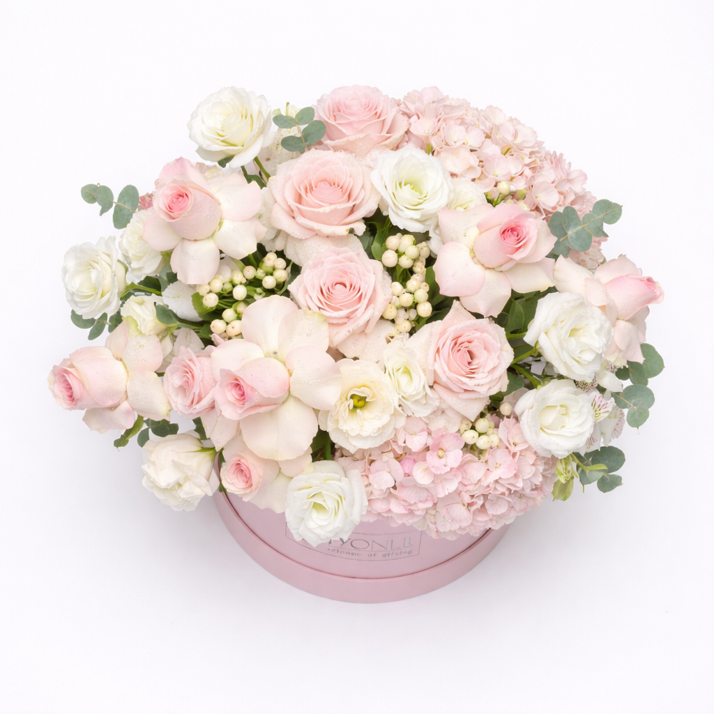 Blush Petal Symphony is a serene blend of blush roses, ivory blooms, and soft hydrangeas, elegantly arranged in a signature Fyonlli hatbox. With its gentle pastel tones and graceful design, this arrangement embodies warmth, gratitude, and togetherness — making it a beautiful choice for Ramadan gifting.