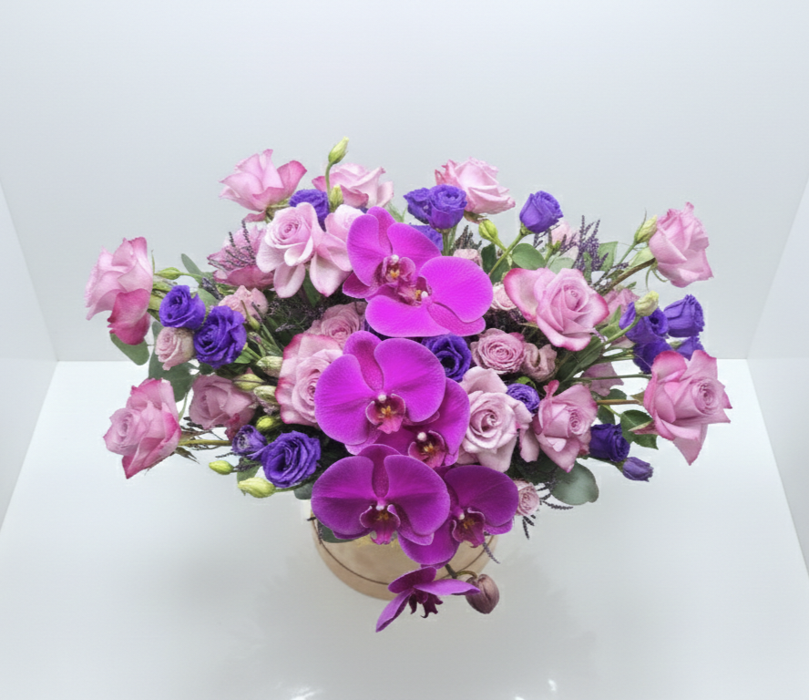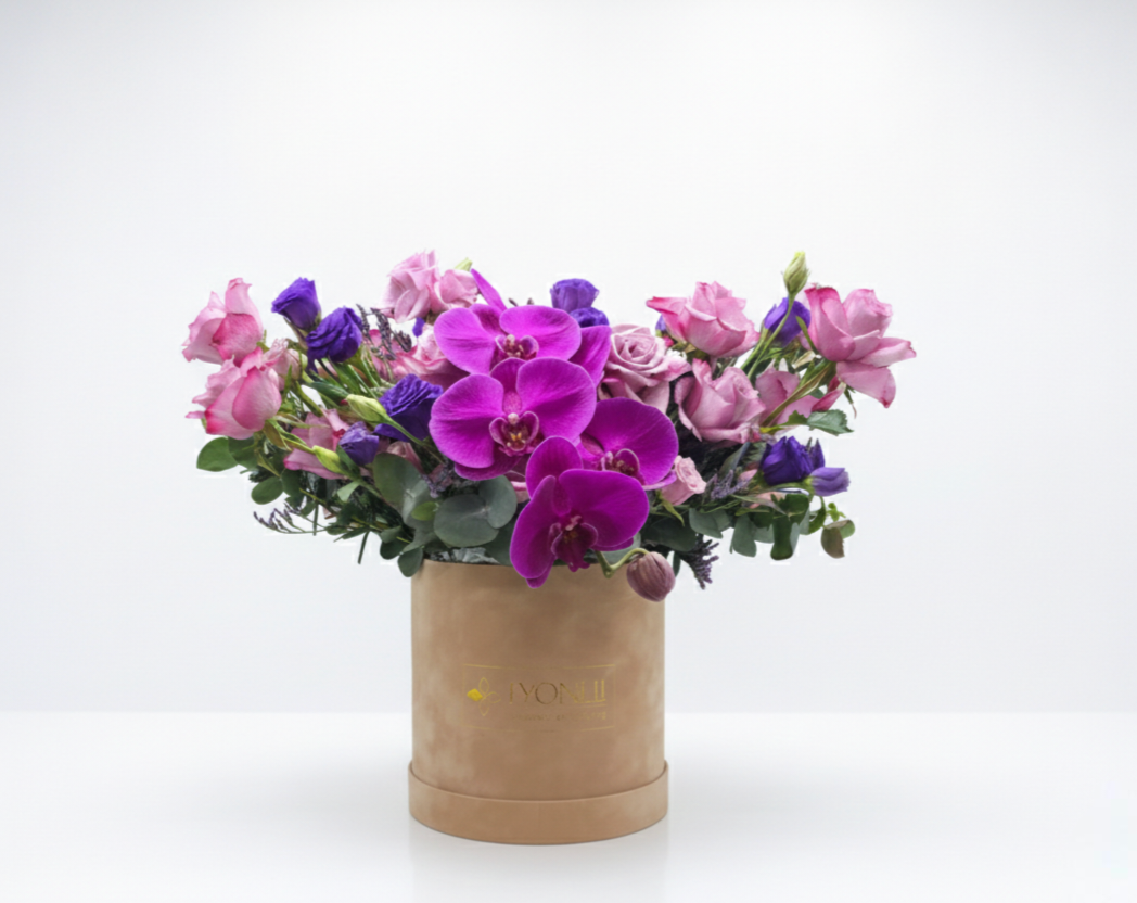 Embrace the tranquility of Ramadan with Lavender Dreams, a masterpiece of floral artistry. This luxurious hatbox features a captivating centerpiece of deep purple Phalaenopsis orchids, gracefully surrounded by a lush harmony of premium roses and seasonal blooms in shades of violet and lilac.