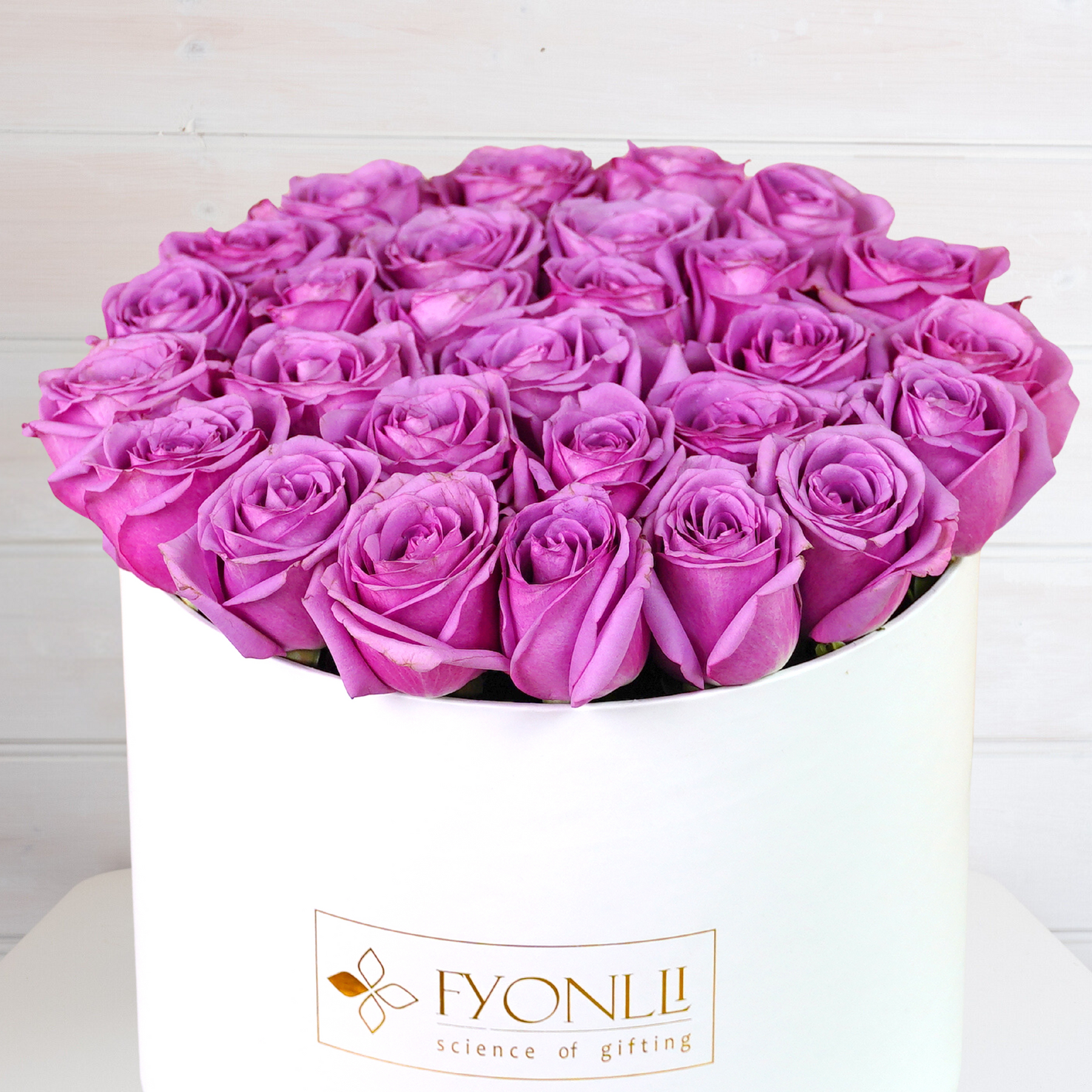 A stunning round box filled with premium purple roses, symbolizing enchantment, elegance, and timeless love — the perfect gift for someone truly special.